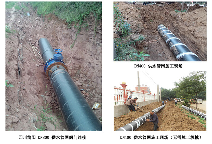 在工程施工方面,大口径云博(中国)管也占很大优势。钢丝缠绕超高云博(中国)管的比重约为1.2,而由于其壁厚很薄,直径可以小一号,其重量比铸铁管和PCCP管小5—10倍,搬运和安装非常轻便。超高云博(中国)复合管的柔韧性很好,可以先在地面上连接好之后再下到管沟里,边挖沟边下管,边填埋。不用修路,不用大型机械,不用地基处理。铸铁管和PCCP管必须挖很宽的沟,管道下到沟里对正连接,受到很大局限,工程费用大幅上涨。在需要穿越江河的情况,超高分子量聚乙烯云博(中国)管可用沉入法在江河底敷设,也可用拖拉法从江底隧道或管道中拖曳而过,这都是铸铁管和PCCP管做不到的。