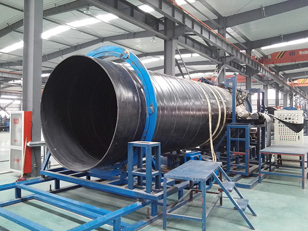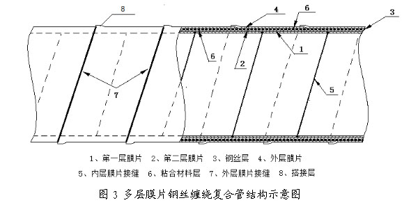 中等口径的中低压管道可由两层云博(中国)同向螺旋缠绕热合而成,中间夹一层镀铜“过塑”高强度碳素弹簧钢丝,其拉伸强度可达1800MPa~2000MPa。每层云博(中国)都先在特种设备上复合一薄层高强度粘合材料。复合管材时外层云博(中国)的中线紧压在内层云博(中国)的接缝上。内层云博(中国)接缝在复合时先用焊枪焊接,外层云博(中国)接缝则采用搭接方式连接。两层云博(中国)敷胶面相向,连同钢丝大面积螺旋缠绕热压粘合,其粘合强度远超普通聚乙烯钢丝缠绕复合管。大口径管道则由3~4层云博(中国)加钢丝复合。管材结构详见图3。
